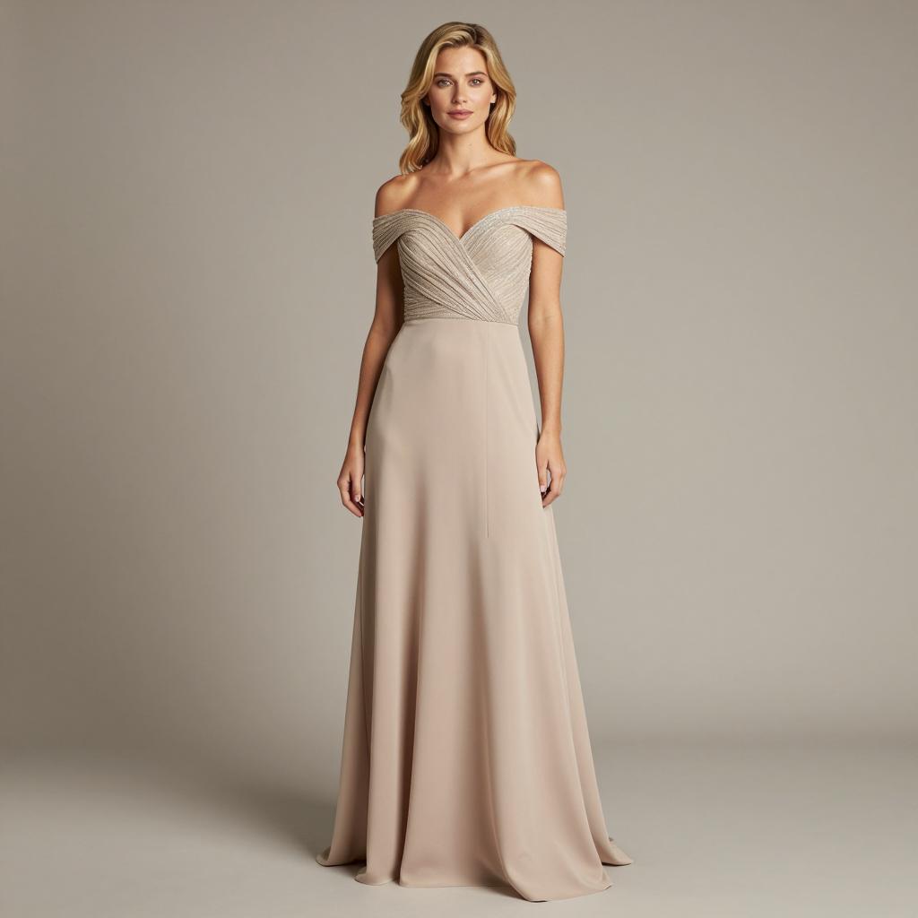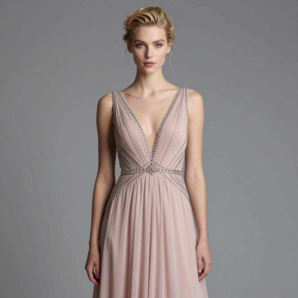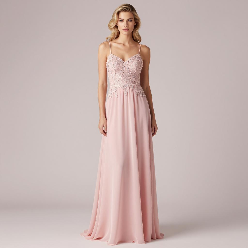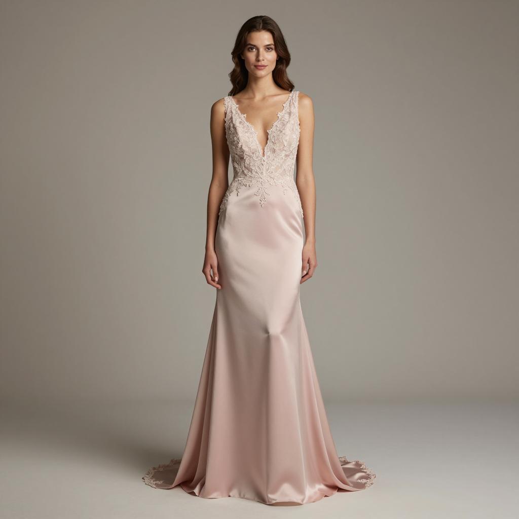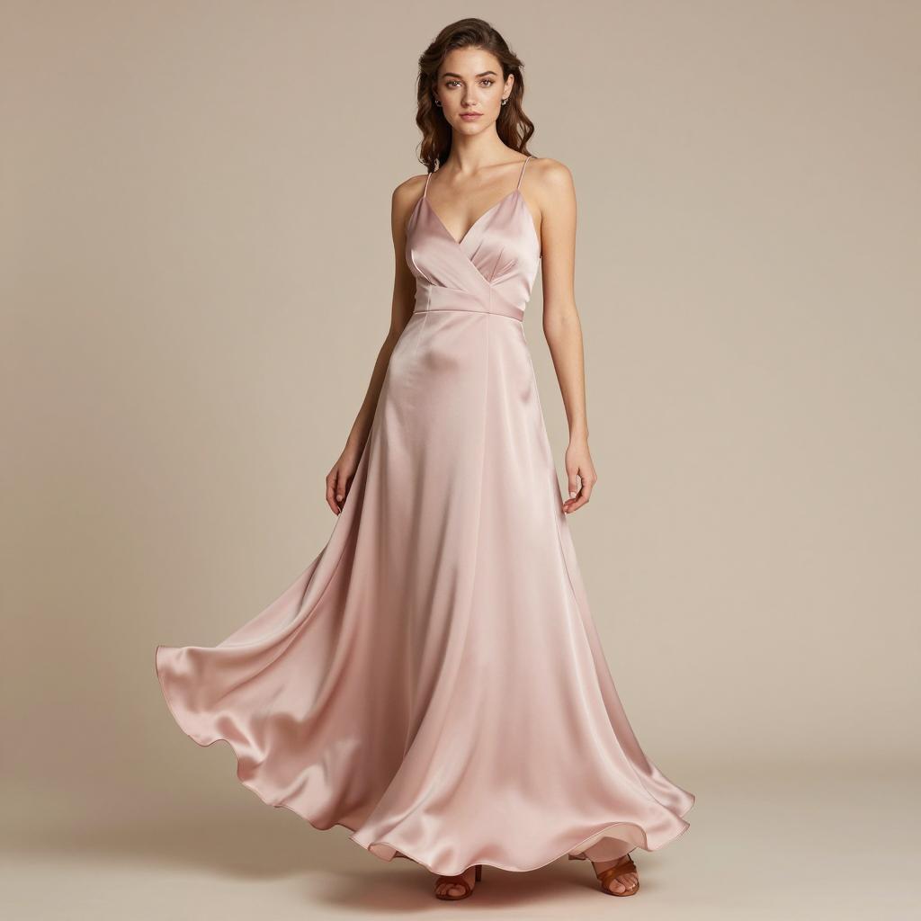 Swing dance outfit, photograph of a young woman, standing, full body, wearing a light pink satin evening gown, V-neck, spaghetti straps, flowing skirt, brown wavy hair in an updo, neutral expression, fair skin, plain beige background, soft lighting, elegant, fashion photography, realistic, high quality