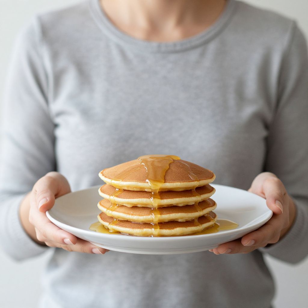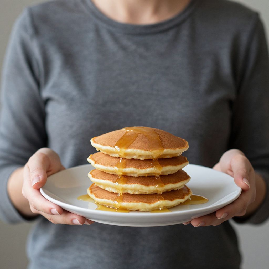 Photograph of a person from the neck down, wearing a light gray, long-sleeved sweater, holding a white plate with a stack of golden-brown pancakes covered in syrup. The person's hands, with light skin and neatly trimmed nails, are positioned on either side of the plate. The background is blurred and white, focusing attention on the plate of pancakes. The lighting is bright and even, highlighting the textures of the syrup and pancake layers.