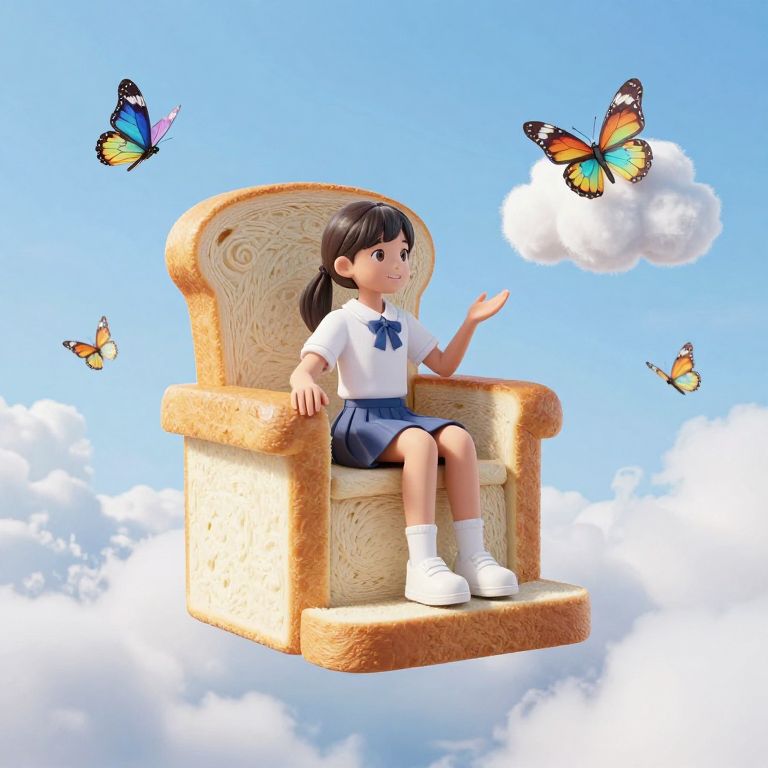 Digital illustration of a young girl in a white shirt and blue skirt, sitting on a bread loaf chair, surrounded by colorful butterflies against a bright blue sky