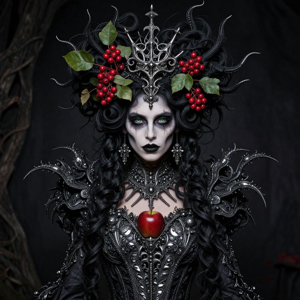 The image depicts a striking gothic woman adorned in intricate, hypermaximalist attire that exudes an ominous and haunting atmosphere. Her elaborate headpiece, a fusion of dark, twisted hair and ornate, metallic elements, is crowned with a crown-like structure embellished with red berries and green leaves, evoking a sense of nature's decay. The woman's face is painted with a detailed, almost skeletal makeup, accentuating her striking green eyes and dark lips. Her ornate, black, and silver dress is adorned with intricate patterns and textures, including a central cutout that reveals a red apple, adding to the surreal and fantastical quality of the scene. The overall composition is dense and layered, with the woman's figure centrally positioned, surrounded by a dark, shadowy background that enhances the gothic ambiance. The image is reminiscent of the work of Ernst Haeckel and Charles Audubon, with its detailed, naturalistic elements and a cinematic quality that suggests a scene from a fantastical narrative.