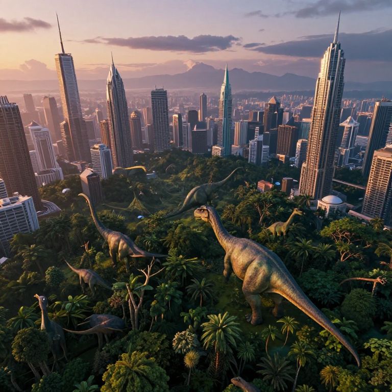 Craft an enchanting digital landscape in the vein of fantasy art, reminiscent of \"Dinotopia,\" where dinosaurs and humans coexist harmoniously within a lush, dreamlike setting. From an aerial perspective, witness a grand Pteranodon gliding above a vast forest, its wings extending long shadows over the verdant canopy beneath. The vivid color palette featuring rich emerald greens and golden sunsets creates a striking contrast with the ancient creatures roaming peacefully near shimmering streams and majestic waterfalls. Incorporate fantastical elements like floating islands adorned with mysterious ruins, seamlessly blending this mesmerizing realm with our own world while evoking a sense of awe and enchantment.