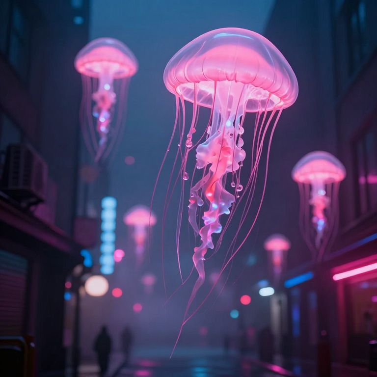 Neon-lit streets hum with otherworldly energy as antigravitational jellyfish float serenely overhead, their radiant pink forms casting ethereal trails that dance across the misty urban landscape.