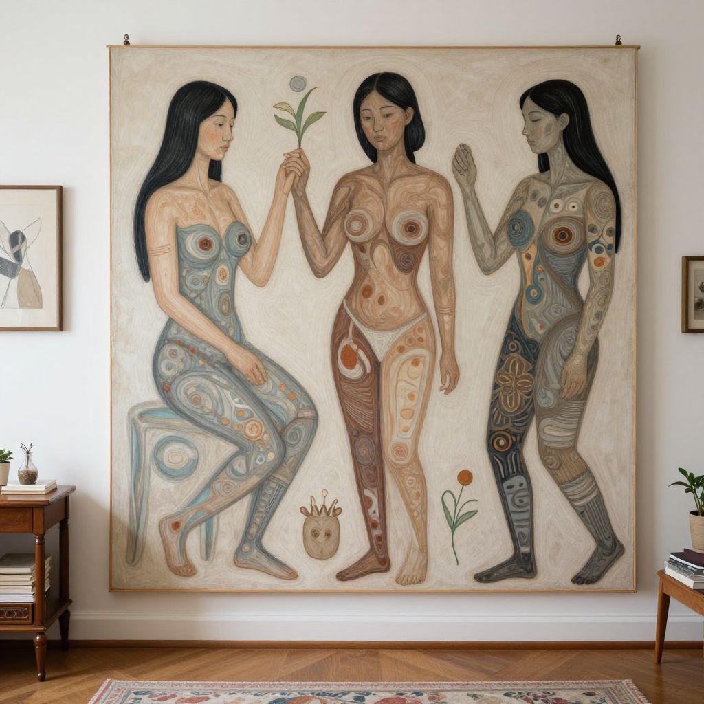 This photograph captures a large, colorful painting in a modern, minimalist room. The painting features three women with long black hair, standing against a cream background. The central figure is nude with intricate, patterned tattoos covering her torso and legs, holding a flower. The woman on the left wears a blue, patterned dress with similar tattoos and holds another flower. The woman on the right is also nude with tattoos, standing with arms raised. Small framed artworks hang on either side, and a wooden side table with a potted plant is on the left. The floor is wooden, and a patterned rug is partially visible.