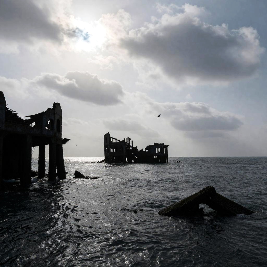 Photograph of a dystopian seascape with dark, silhouetted ruins rising from the ocean. Foreground has a twisted, partially submerged structure with birds flying nearby. Background shows more ruins with a cloudy sky. Ripples on the ocean's surface reflect sunlight.