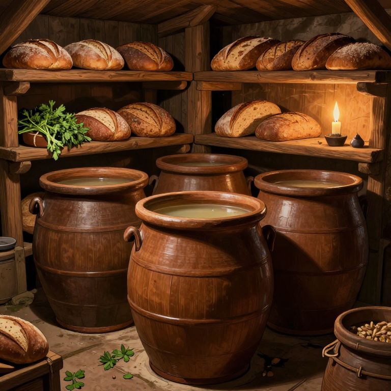 Traditional kvass fermentation scene in a cozy cellar: large earthenware barrels filled with fermenting kvass, surrounded by wooden shelves packed with rye bread and fresh herbs, illuminated by warm candlelight, rendered in a detailed digital art style with deep shadows and highlights.