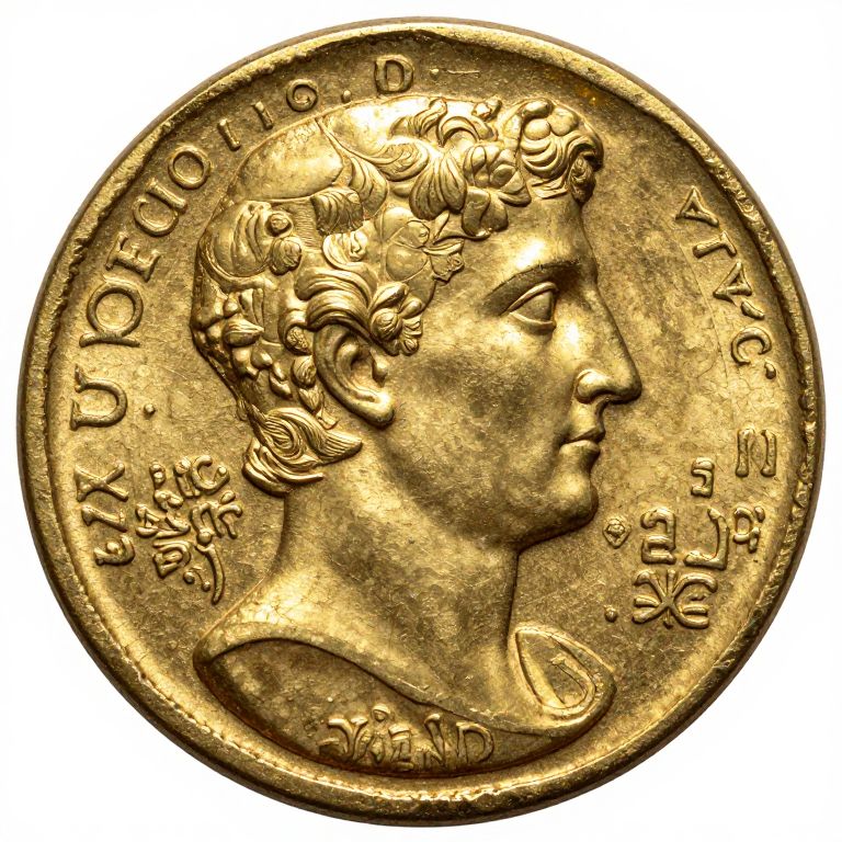Aureus coin from ancient Rome, detailed close-up of gold texture and intricate engravings, softly glowing with historical aura, vintage numismatic style, high resolution.
