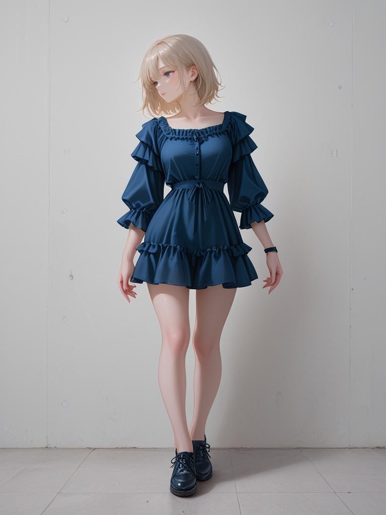 1girl, realistic face, full body shot, Woman, summer clothing, off-the-shoulder cropped top in a textured fabric and peach color, fitted silhouette, matching mini shorts with a prominent paisley pattern in blue and beige, blue hem finish, statement necklace with a geometric design.
