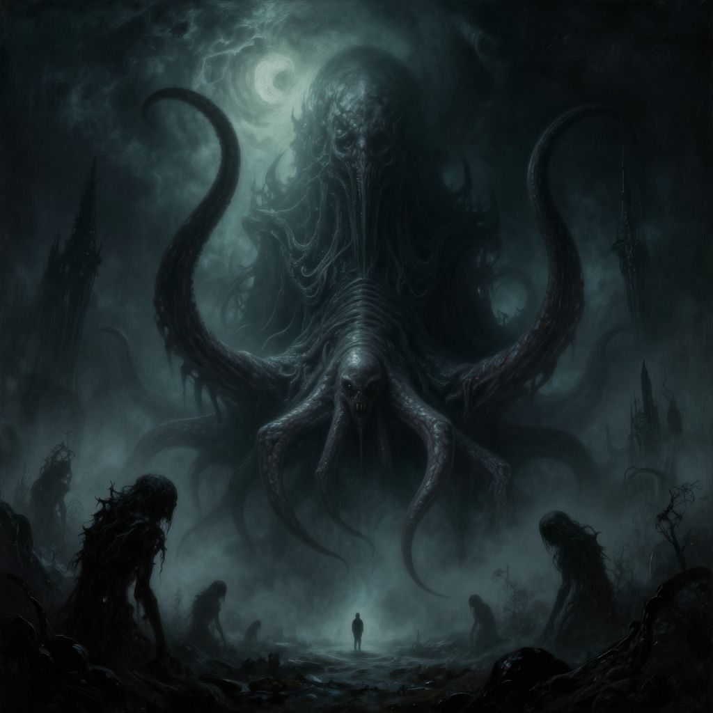 (cosmic horror, Lovecraftian tales, eldritch realms, dark fantasy, eerie atmosphere, dramatic lighting, haunting composition, otherworldly beings, surreal landscapes), H.R.Giger, Zdzislaw Beksinski, cinematic, trending on ArtStation, oil painting, horror genre, Cthulhu, tentacles, monstrous creatures, alien architecture, disturbing imagery, moody, haunting, gothic, dark, eerie, misty, foggy, high quality, photorealistic, dramatic shadows, UHD, 64K, HDR, ethereal, ominous