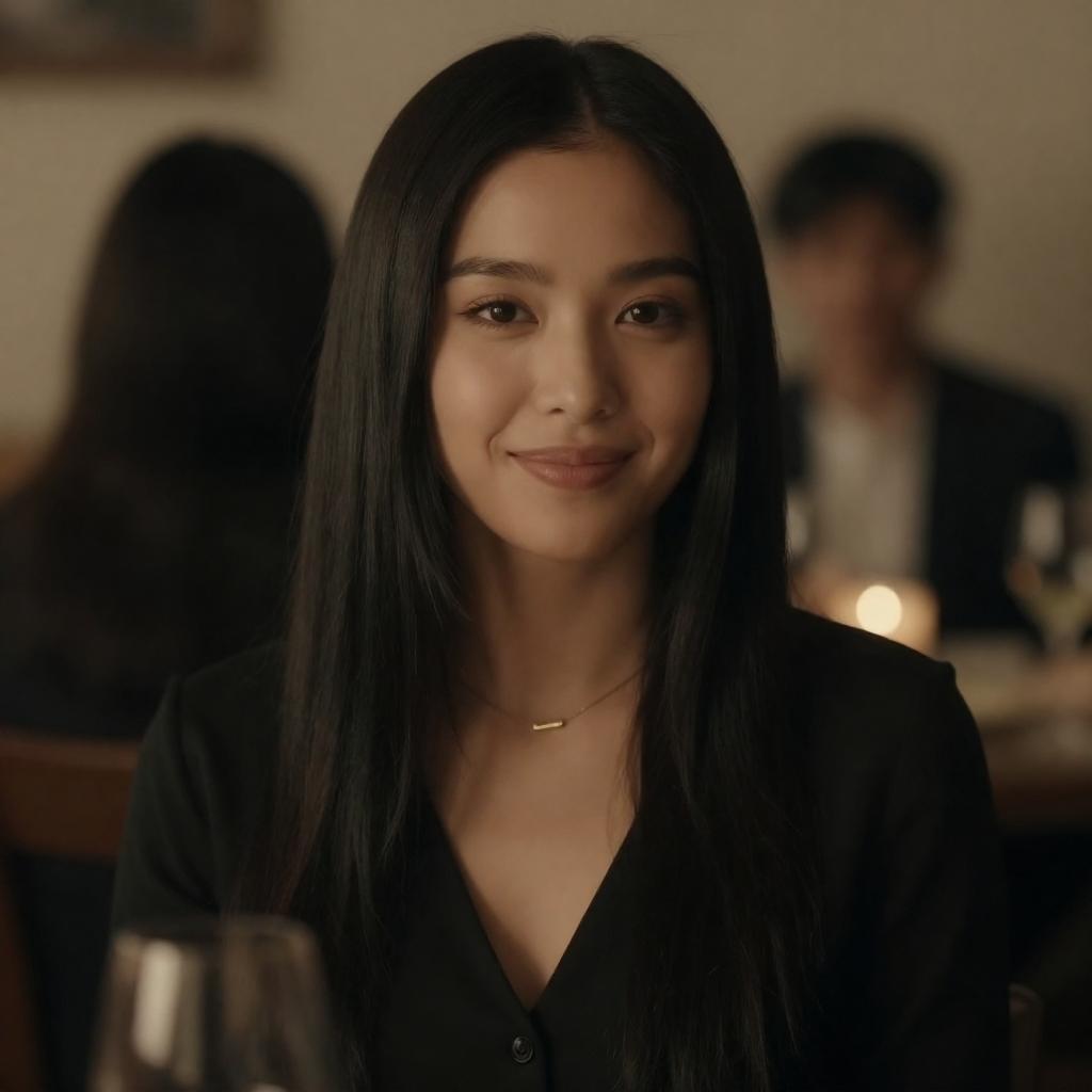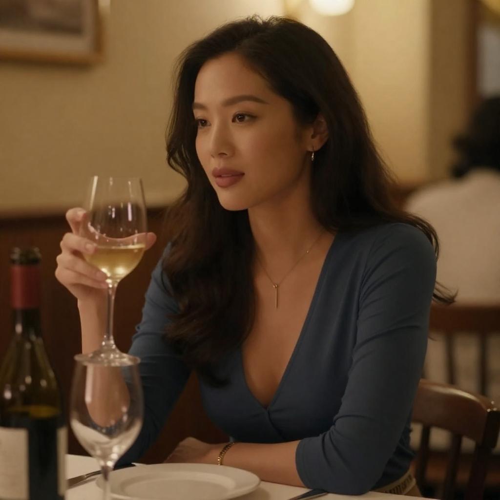 Black-and-white photograph of a short-haired woman with light skin and a slender build, wearing a black, off-the-shoulder dress. She holds a wine glass in her right hand, smiling slightly, with a blurred background and a plate on the table in front of her.