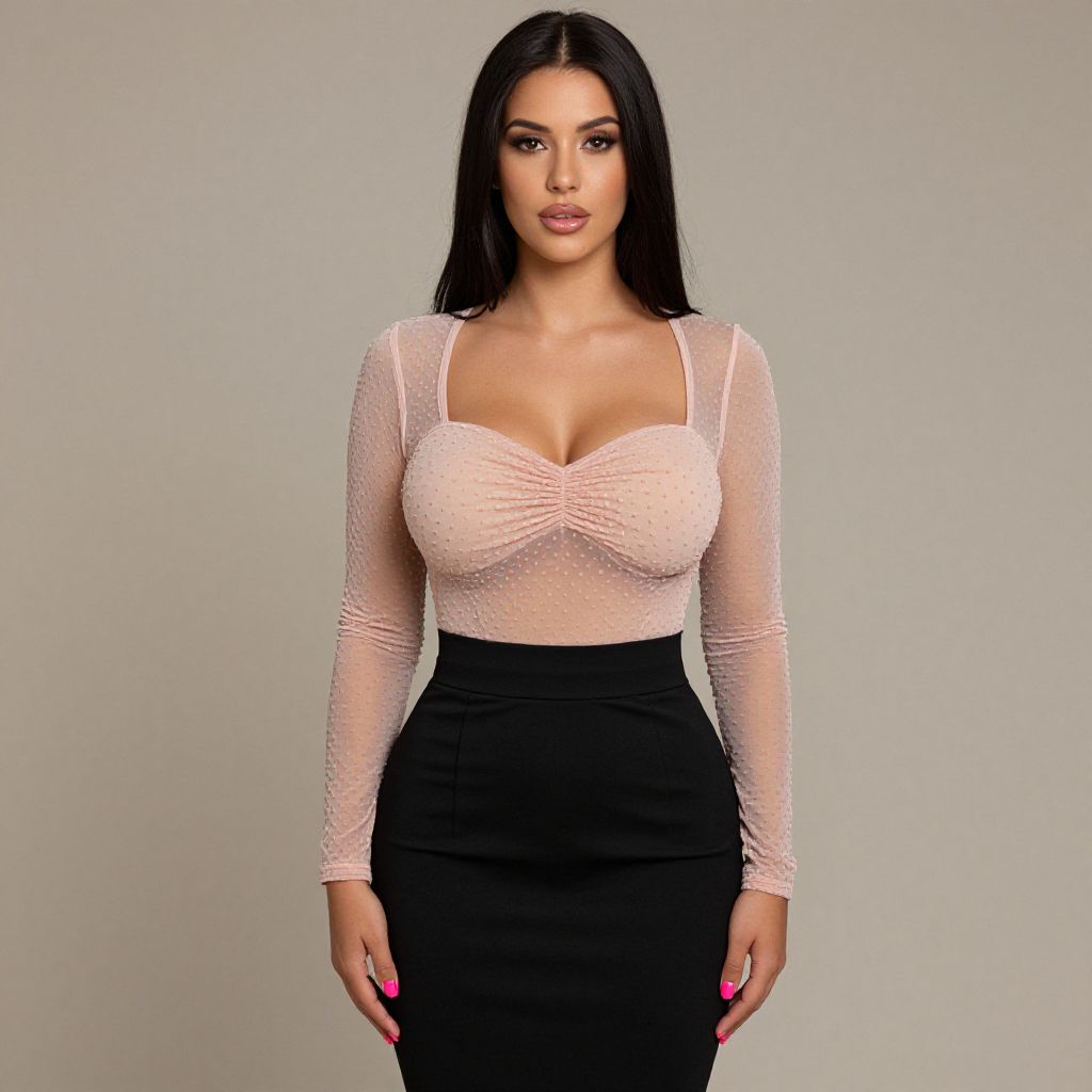 "Woman, contemporary chic, blush pink mesh top with polka dot detail, form-fitting, long sleeves, sweetheart neckline with ruched bust, paired with a high-waisted black pencil skirt, knee-length, plain manicure with hot pink nail polish, plain backdrop.. Sexy. Pretty face and beаutiful eyes. Big breasts."
