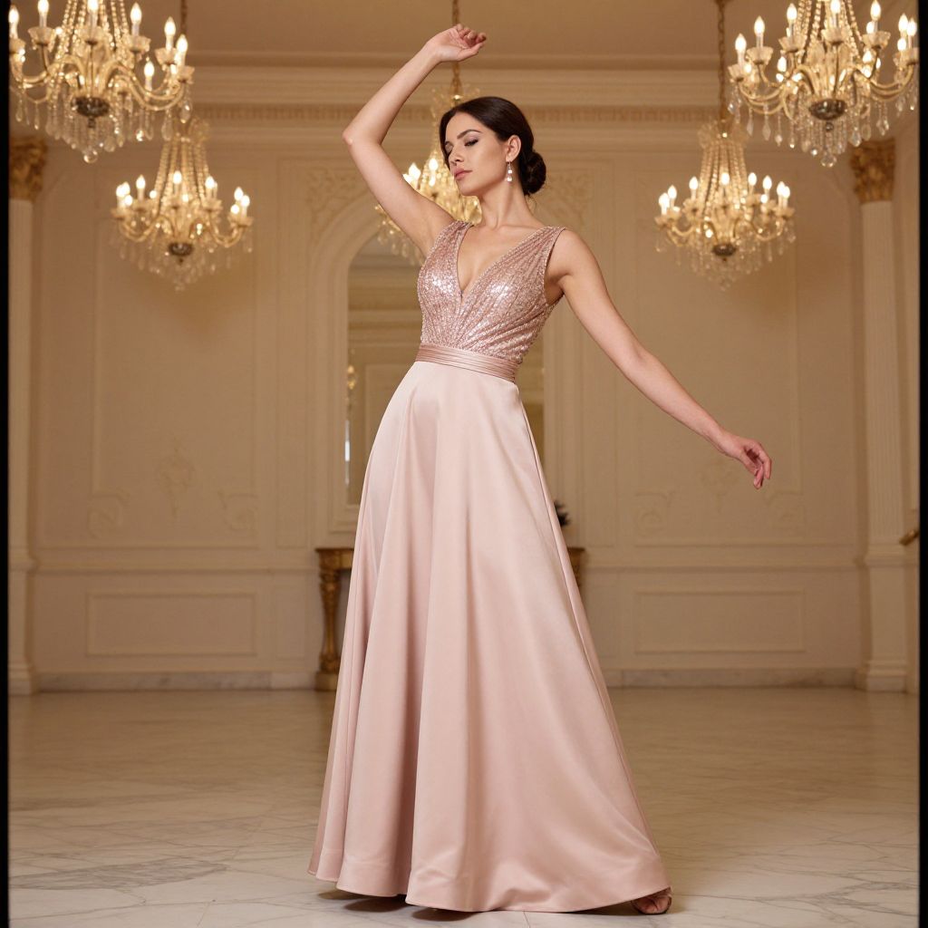 Photograph of a slender, light-skinned woman with dark brown hair in an elegant updo, wearing a sleeveless, floor-length, pale pink satin gown with a sparkling, sequined bodice. She poses gracefully with one arm raised and the other extended, standing in a grand, ornate room with cream-colored walls and intricate molding. The background features large, golden chandeliers and a marble floor. The lighting is soft, highlighting the gown's shimmer and the room's luxurious details. The woman's expression is poised and confident, embodying elegance and sophistication.