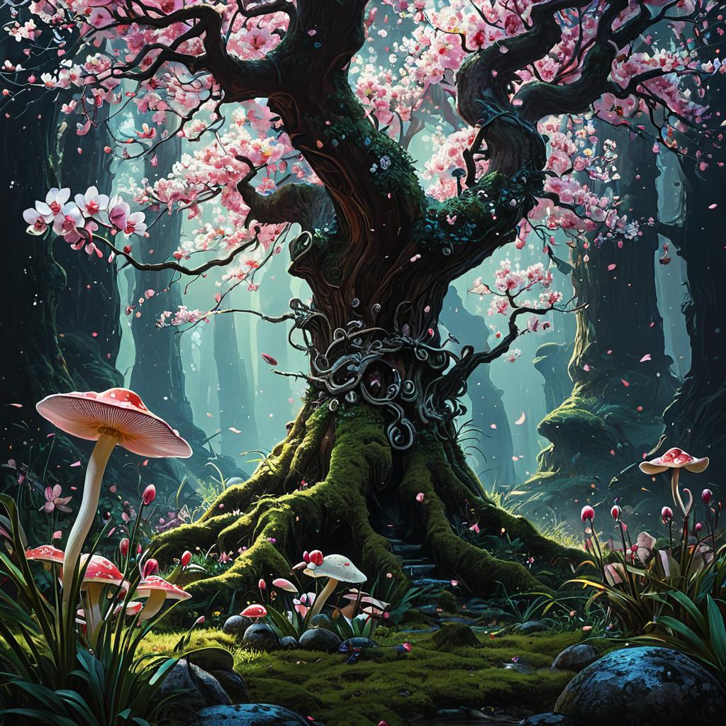 Highly detailed digital painting of a large cherry blossom tree with pink flowers and moss-covered roots in a dark, enchanted forest. Surrounding the tree are various red and white mushrooms growing among lush greenery and rocks. The scene features diffuse, mystical lighting that enhances the fantasy and psychedelic atmosphere.