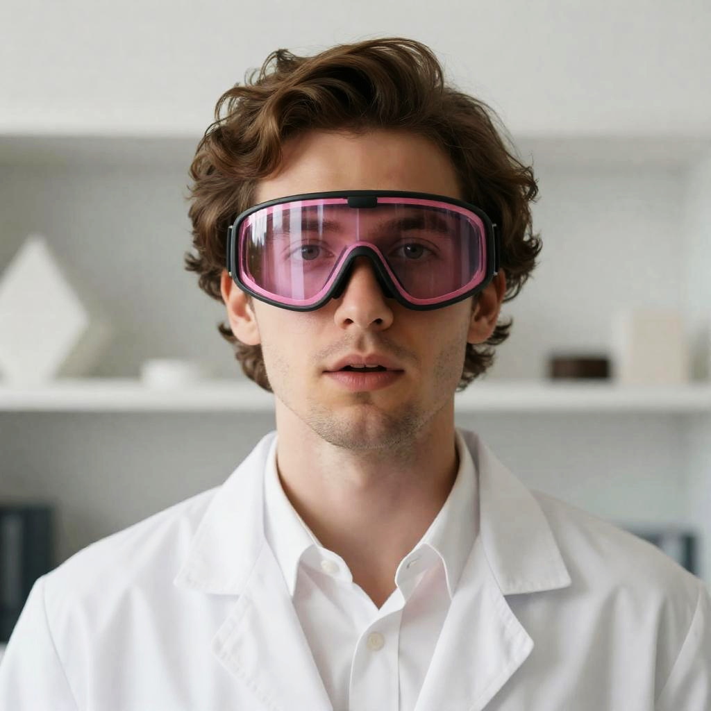 Photograph of a man with light skin, brown wavy hair, and pink-tinted reflective goggles. He wears a white lab coat over a white shirt. His mouth is slightly open. Background includes white shelves with geometric objects. He is the primary subject, centered, facing the camera.