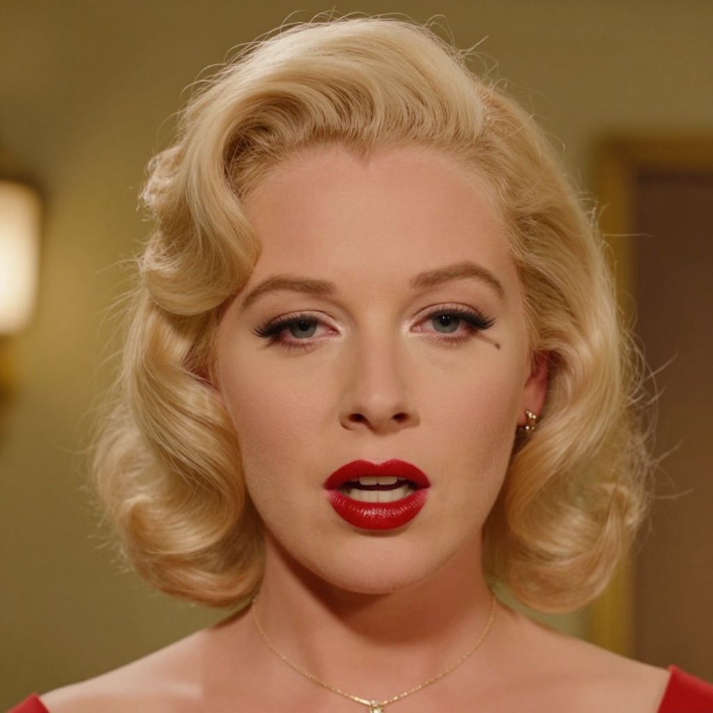 This is a vibrant, close-up photograph of a blonde woman with iconic, 1950s-style curled hair and bold red lipstick. She has a small beauty mark under her left eye and wears a delicate necklace with a pendant. Her eyes are partially closed, giving a slightly surprised or sensual expression. The background is a dimly lit, vintage-style room with warm, yellow lighting.