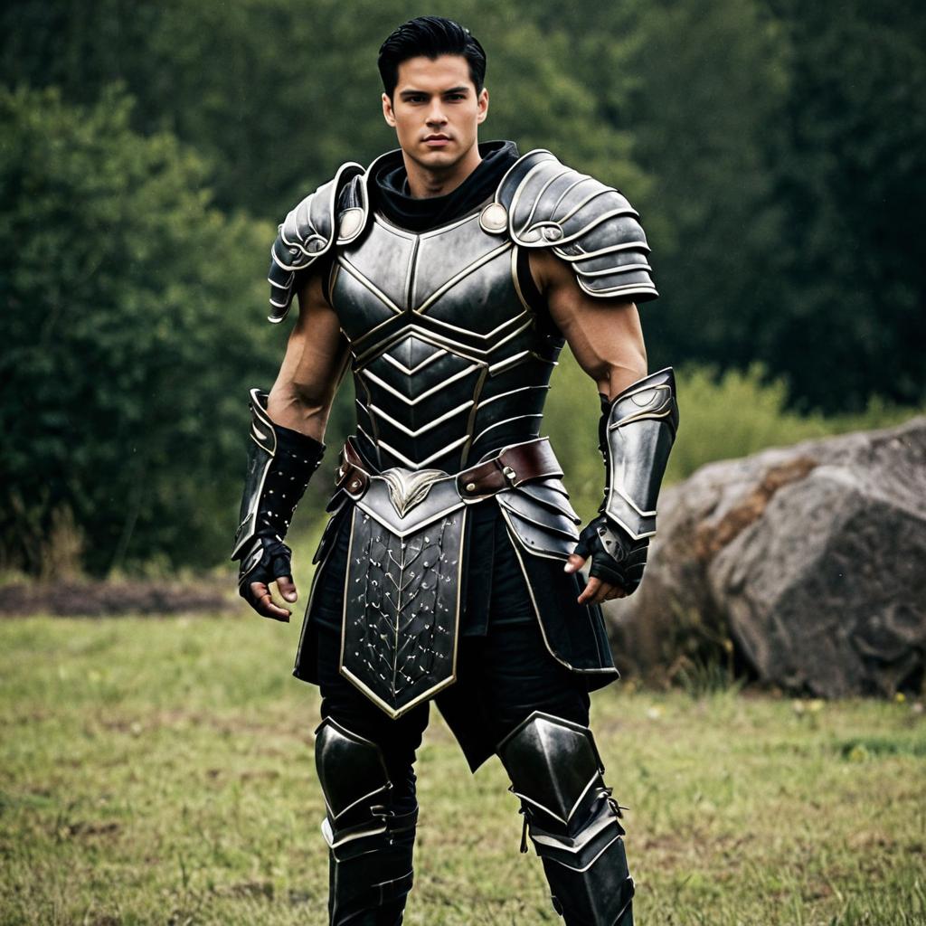 Warrior costume male,1boy, male focus, solo, shoulder armor, black hair, armor, pauldrons, muscular, short hair, boots, standing, abs, outdoors, muscular male, navel, single pauldron, pectorals, nipples