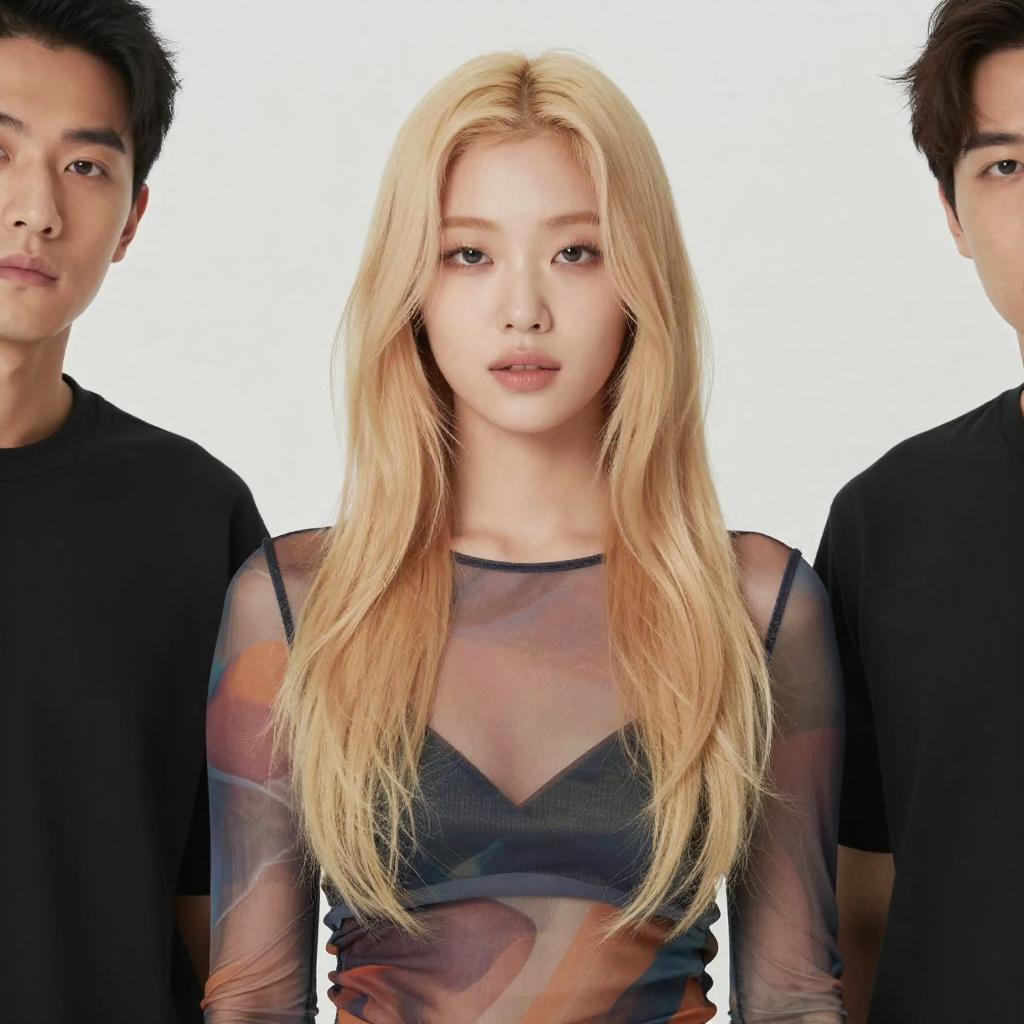 Photograph of a young woman with long, wavy blonde hair and light skin, wearing a sheer, long-sleeved top with a colorful, iridescent pattern. She has a neutral expression, with slightly parted lips, and is flanked by two men in black shirts. The background is plain white.