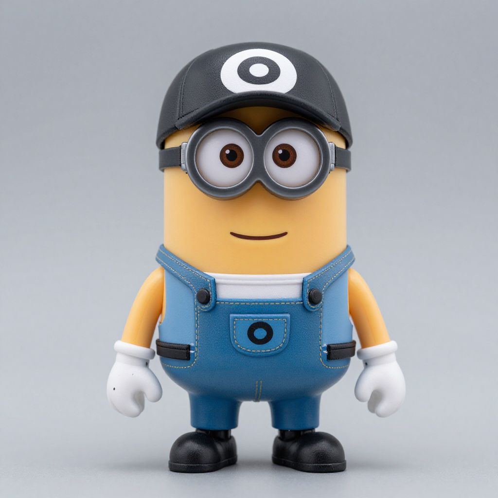 Photograph of a Minion-like toy with yellow skin, black baseball cap, goggles, blue overalls, white shirt, and white gloves.