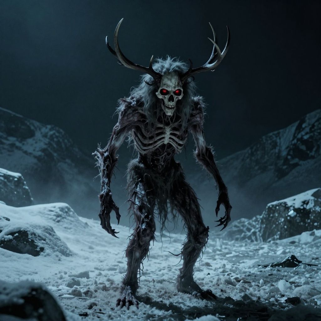 A digital artwork depicts a terrifying, skeletal creature with large, twisted antlers standing in a snowy, mountainous landscape at night. The creature's skeletal frame is covered in tattered, dark fur, with glowing red eyes and a gaping, tooth-filled mouth. Its long arms and legs are muscular and shadowy, adding to its menacing appearance. The background is dark blue, with snow-covered rocks and a misty atmosphere. The creature's eerie presence is highlighted by the cold, blue lighting, creating a chilling and supernatural effect. The image has a high-contrast, dramatic style.