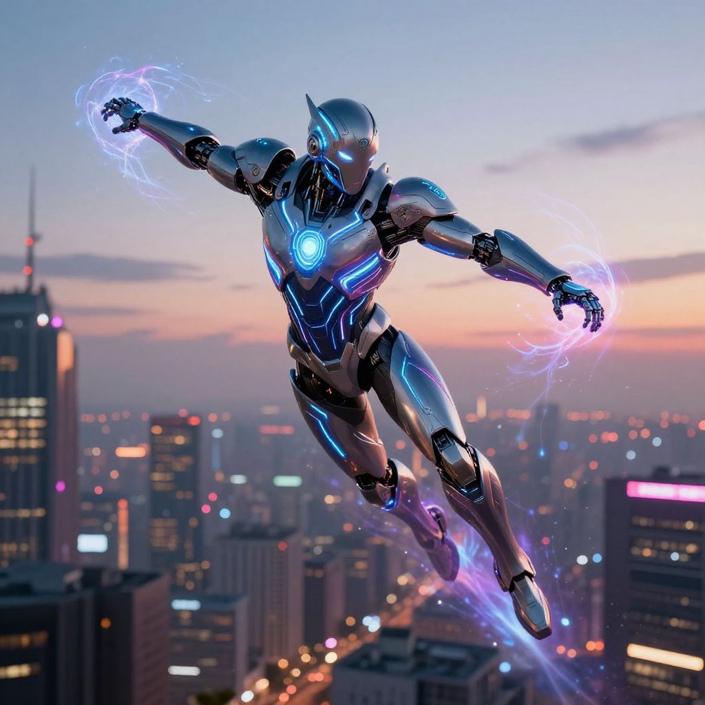 Futuristic AI Superhero Soaring at Dusk