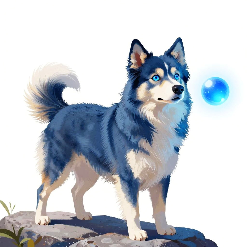 Digital drawing of a blue-furred, fluffy dog with white patches on its face and chest, standing on a gray rock. The dog has glowing blue eyes and is staring at a blue glowing orb hovering in front of its face. The background is plain white, making the dog and orb the focal points. The dog's fur looks soft and textured.