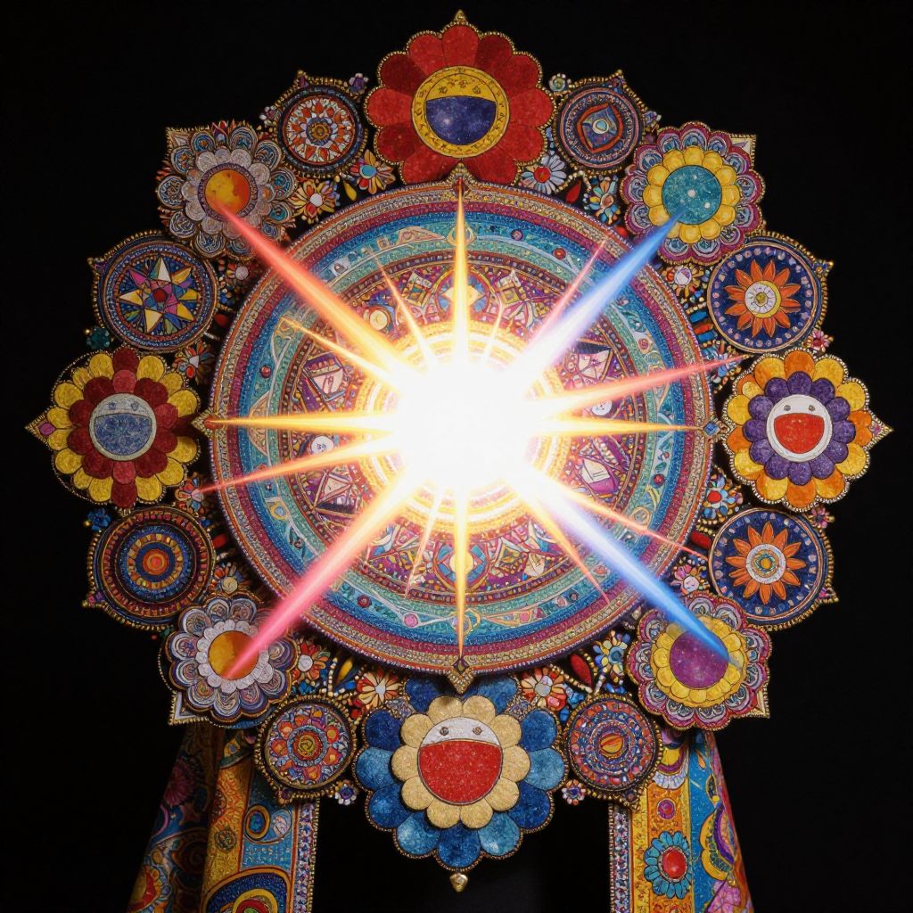 The image depicts a highly detailed and ornate headpiece, reminiscent of a 30-year-old model's attire, adorned with intricate patterns and vibrant colors. The headpiece features a central, radiant burst of light, emanating from an inter-dimensional portal, releasing a burst of flower patterns and geometric designs from another galaxy. The headpiece is composed of various elements, including a large, circular mandala-like design, adorned with intricate patterns and textures, and surrounded by a halo of flowers and geometric shapes. The headpiece is further embellished with a series of smaller, circular designs, each with its own unique pattern and texture. The overall composition is highly detailed, with a strong emphasis on the interplay of colors, textures, and shapes. The lighting is cinematic, with a focus on the central burst of light, creating a sense of depth and dimensionality. The style is reminiscent of Takashi Murakami's 70's kitsch, with a psychedelic and surreal quality. The headpiece is positioned in the foreground, with the background appearing dark and shadowy, emphasizing the intricate details and vibrant colors of the headpiece.