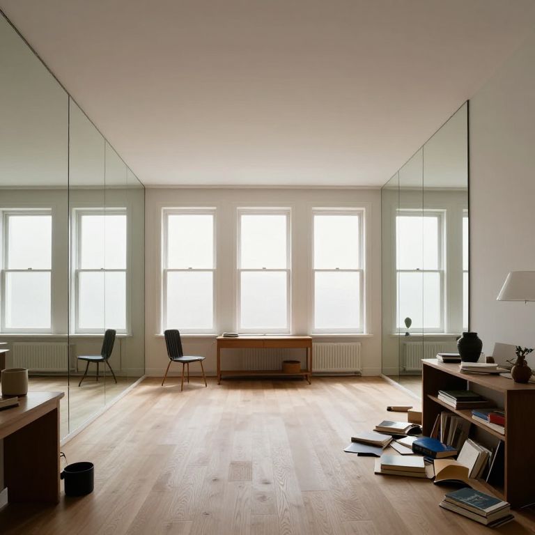 An architectural interior photo comparing two rooms: one exquisitely clean and symmetrical with mirrored walls, centered furniture, and uniform windows, while the adjacent room is chaotic with mismatched furniture, scattered books, and unorganized objects, set in a modern home with soft natural light and strong contrast between the two spaces.