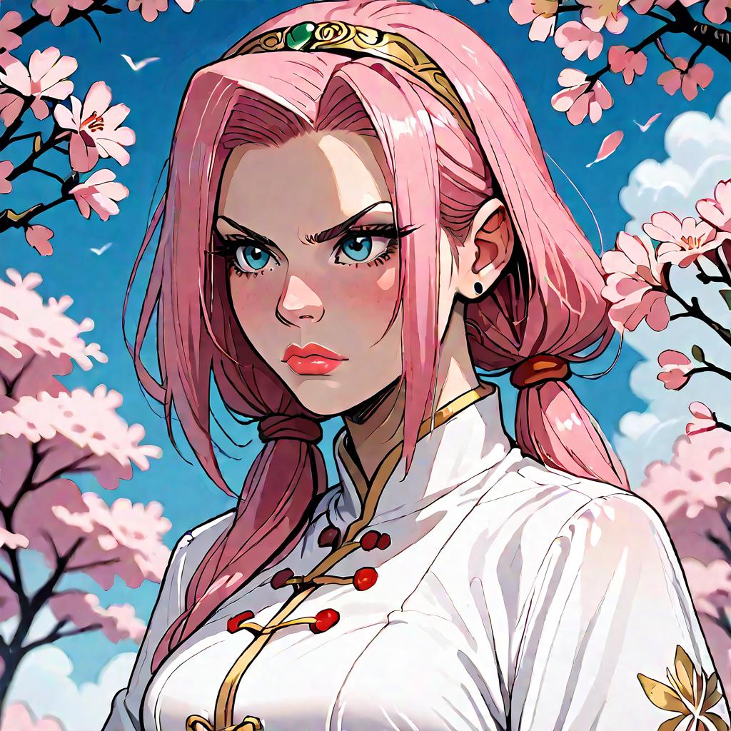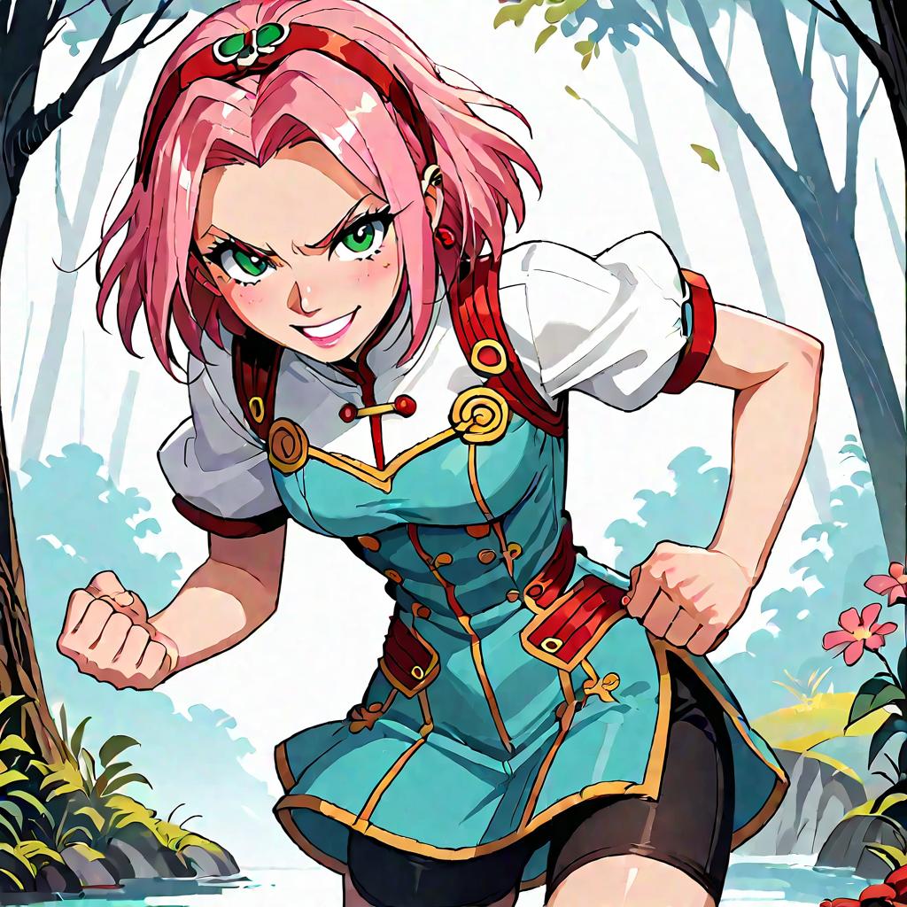Score_9, score_8_up, source_anime, 1girl, haruno sakura, pink hair, long hair, green eyes, red qipao, short sleeves, bike shorts, clenched hands, solo, looking at viewer, angry, standing, smile, cowboy shot, outdoors, forest, anime screencap