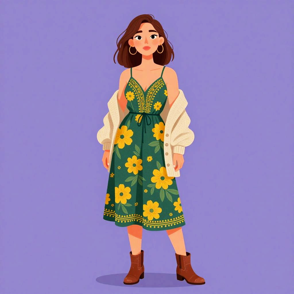 Woman with pretty face and pretty hair. Bohemian sundress, A-line cut, breathable linen, vibrant floral print, deep green and mustard yellow, cinched waist, delicate embroidery, paired with ankle boots, distressed leather, rich brown, oversized cardigan, cozy knit, neutral beige. --sref 1461