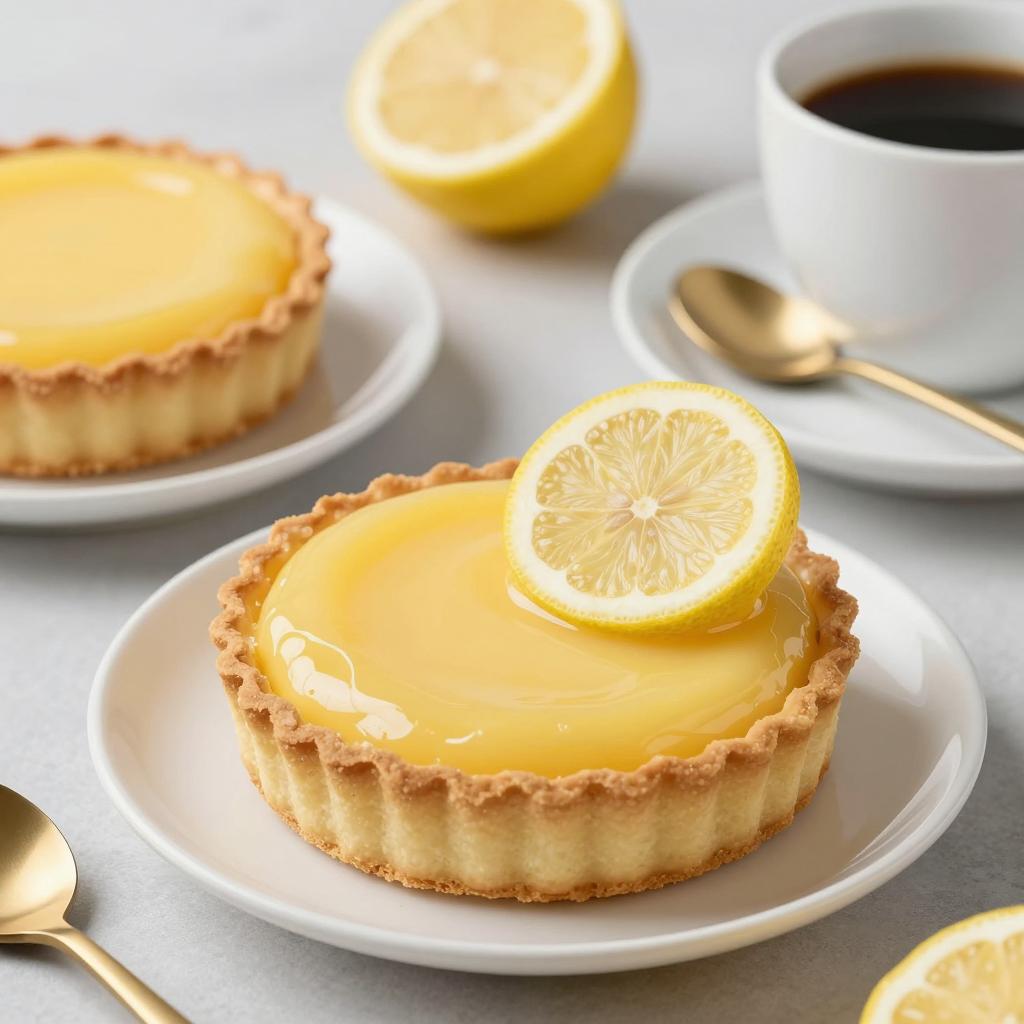 A hyper-realistic close-up of a lemon tart topped with glossy lemon curd and a decorative lemon slice, served on a white plate. The scene includes a second lemon tart, a halved lemon, a white cup of black coffee, and a gold spoon, all set on a light gray background, creating a fresh and inviting cafe atmosphere.