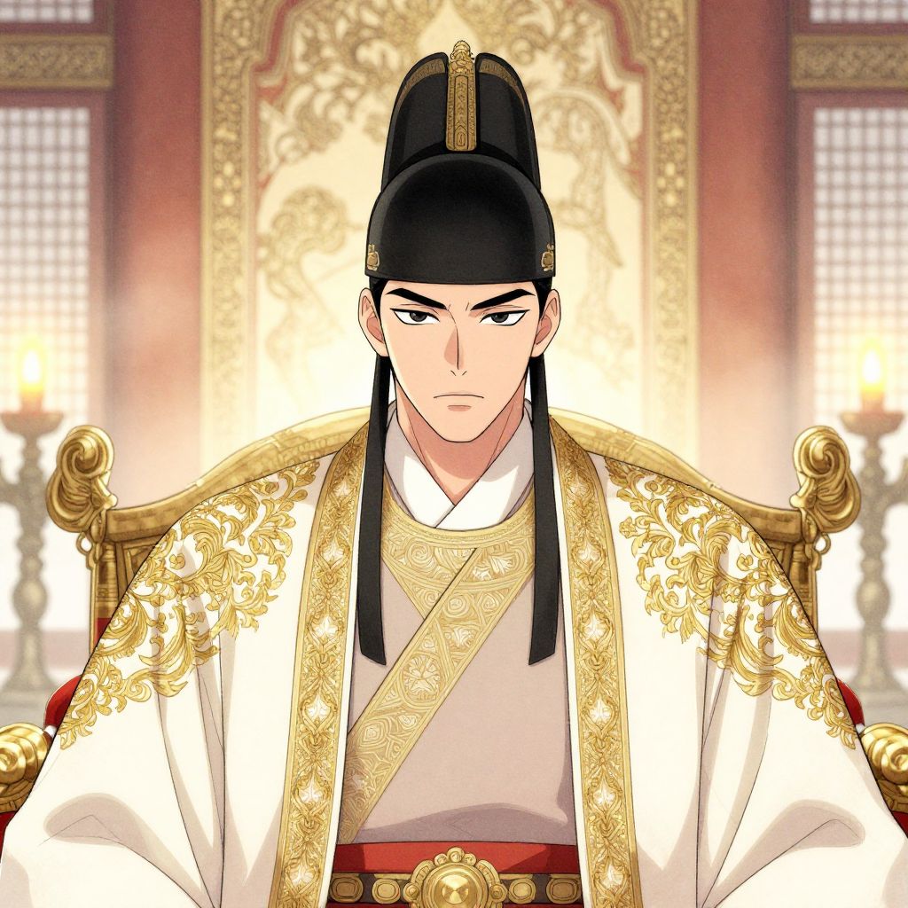 My Kingdom manhwa character portrait of a noble king with a stern gaze, dressed in elegant royal robes adorned with gold embroidery, a detailed throne room background with traditional Korean architecture and soft glowing candlelight, fine line art with watercolor texture.