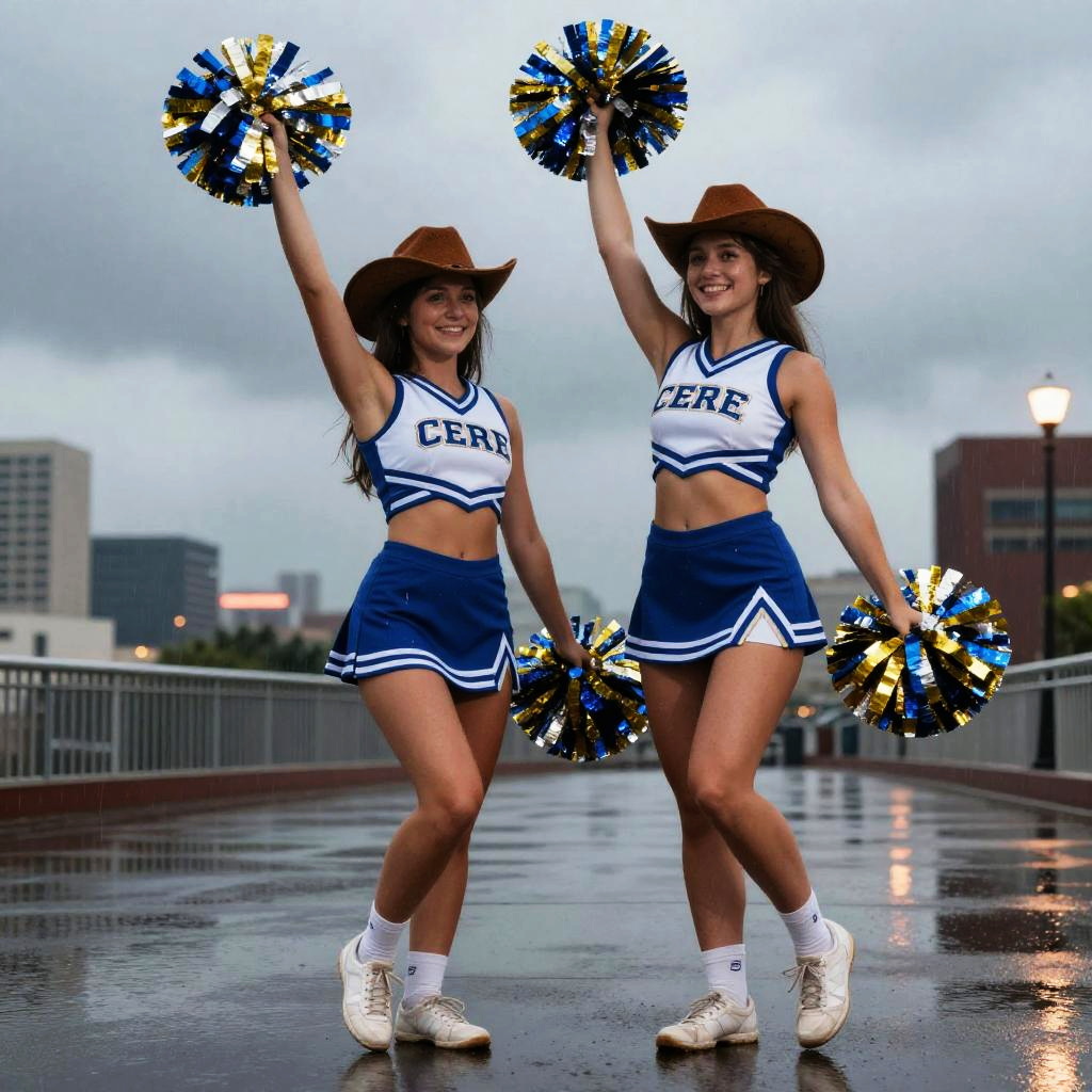 (8k, RAW photo, best quality, masterpiece:1.2), (realistic, photo-realistic:1.37), ((2girls)), (((wearing cheerleader outfit))), (holding pom poms), cowboy shot, cute, petite, slim, smiling, cityscape, twilight, rainy weather, gray clouds, rain, wet, professional lighting, photon mapping, radiosity, physically-based rendering, dynamic pose, moving, ((large breasts:1)), cameltoe