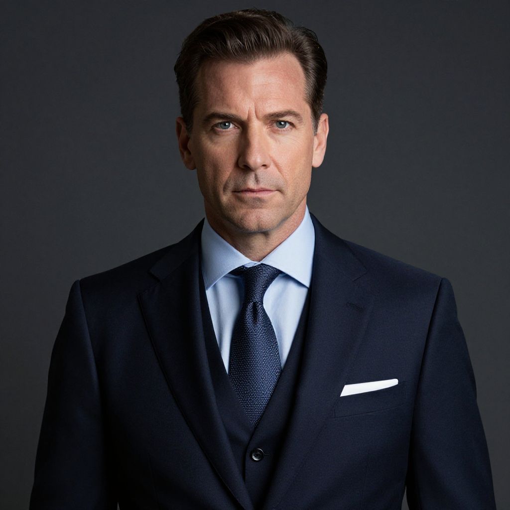 A man, navy herringbone suit, light gray dress shirt, patterned silk tie in shades of blue, black leather derby shoes, sleek high-rises, panoramic city views, 3M ferrania analog film stock, confident expression Man has masculine face and piercing eyes