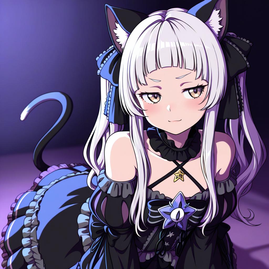 Digital anime-style drawing of a catgirl with long white hair, black cat ears, and a black frilled dress adorned with blue and purple ribbons. She has pale skin, yellow eyes, and a subtle smile. A black cat tail curls behind her. The background is a gradient of dark purple and black, with a soft purple light illuminating her from the left. She wears a star-shaped necklace and a blue gem on her dress. The overall style is vibrant and detailed, with a focus on her cute and slightly mysterious expression.