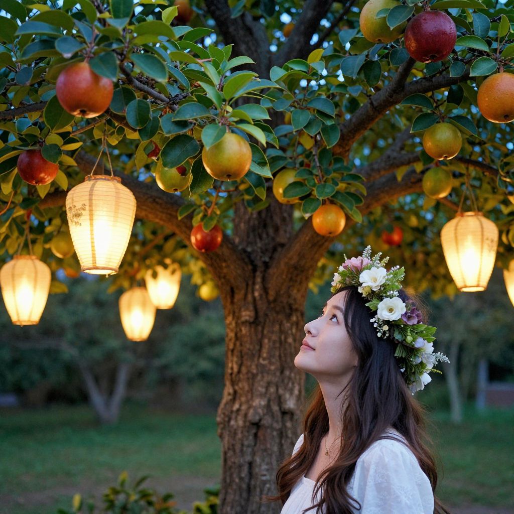 Photograph of a young Asian woman with long, wavy brown hair and fair skin, wearing a white dress and a floral crown. She stands under a tree laden with apples, illuminated by glowing paper lanterns hanging from the branches. The tree has green leaves and red-orange apples, with a blurred forest background at dusk. The woman gazes upward, her expression serene and dreamy, with soft, warm light from the lanterns casting a gentle glow on her face and the apples. The overall mood is magical and tranquil.