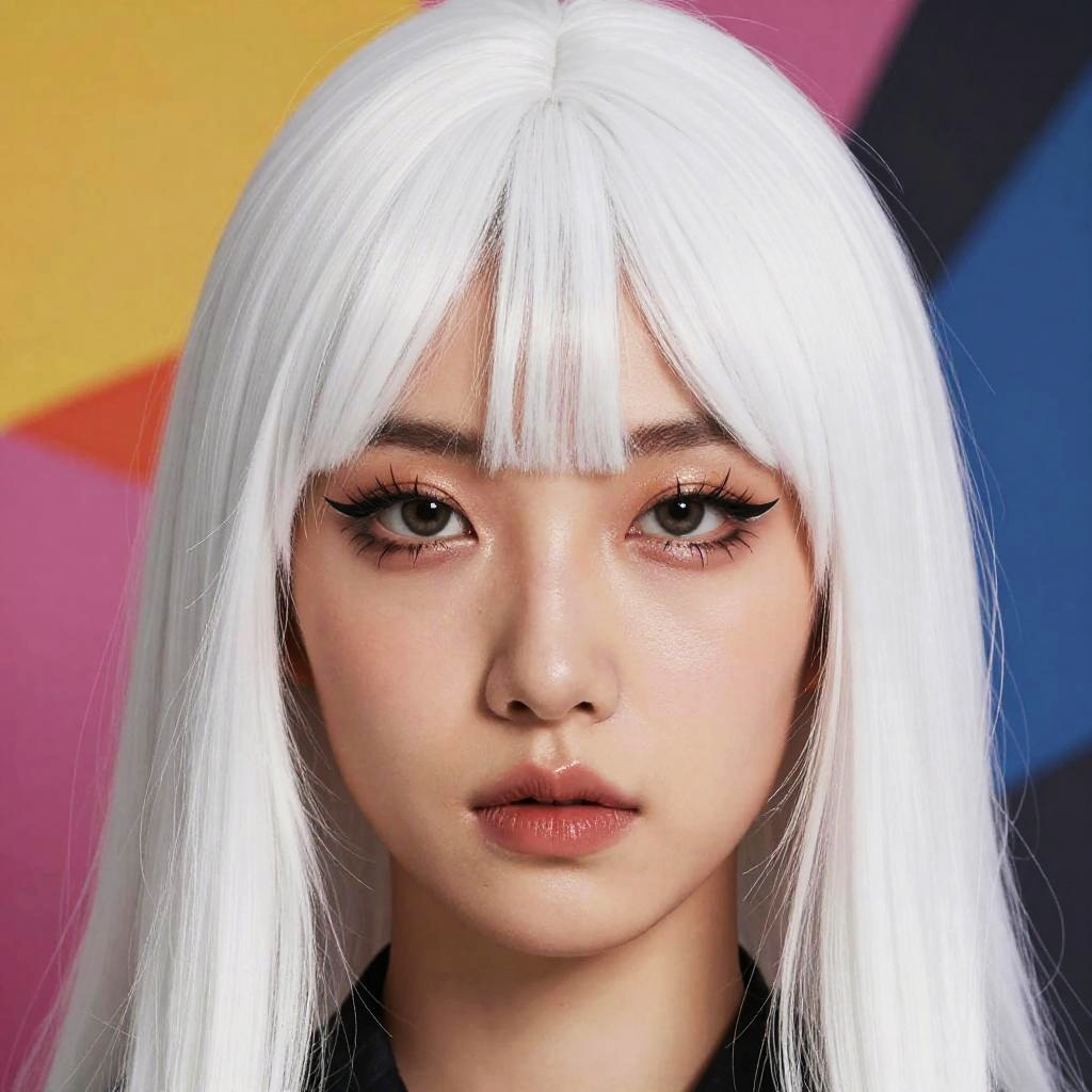 Close-up of a model with white hair bangs, avant-garde makeup and abstract background, bold colors, high fashion editorial style, sharp focus on facial features