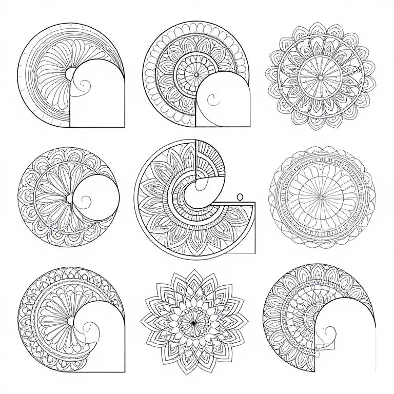 Fibonacci coloring pages with intricate mandala designs based on Fibonacci spirals, symmetrical and flowing patterns designed to engage focus and relaxation, complex black and white illustrations ideal for detailed coloring.