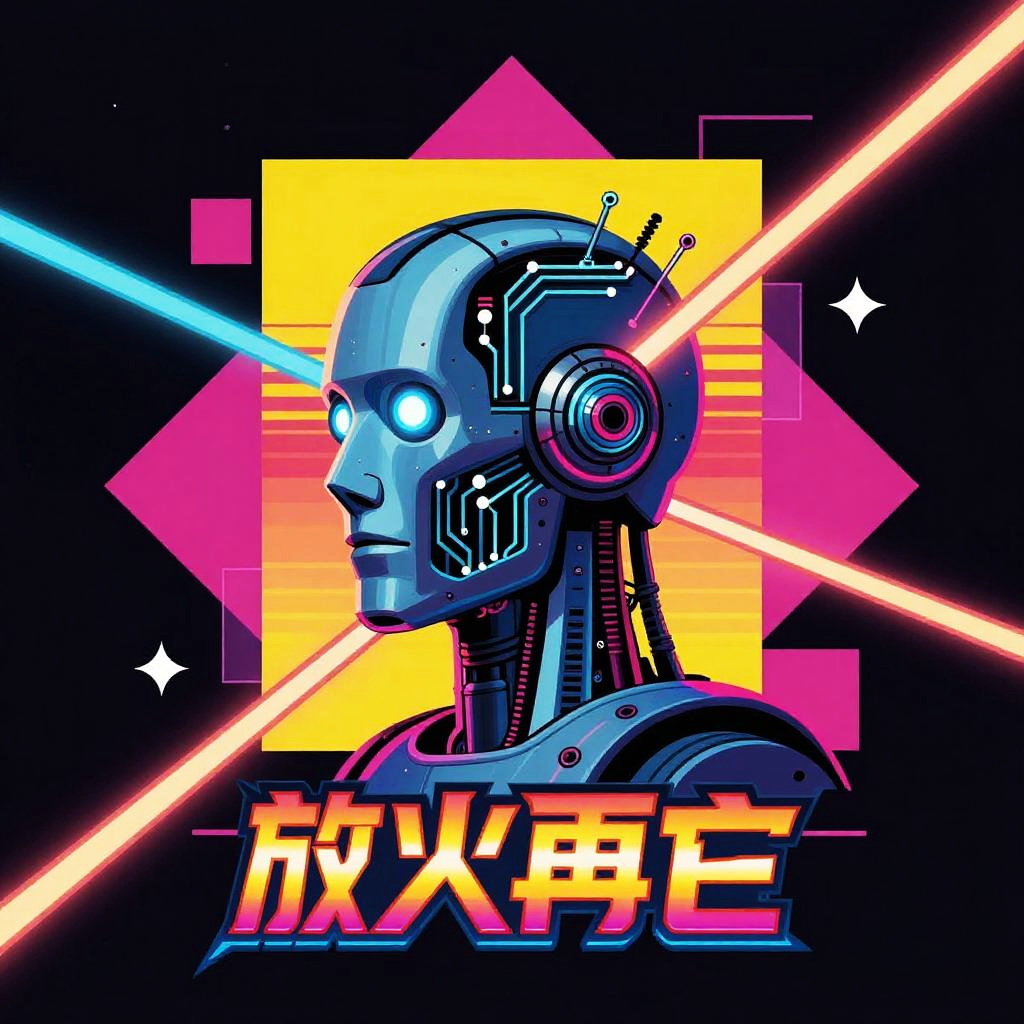 AI generator movie poster, retro-futuristic design, bold geometric shapes, vivid contrasting colors, robotic head with glowing circuitry lines, stylized fonts reminiscent of 80s sci-fi films, dynamic energy beams crossing poster, nostalgic yet modern aesthetic