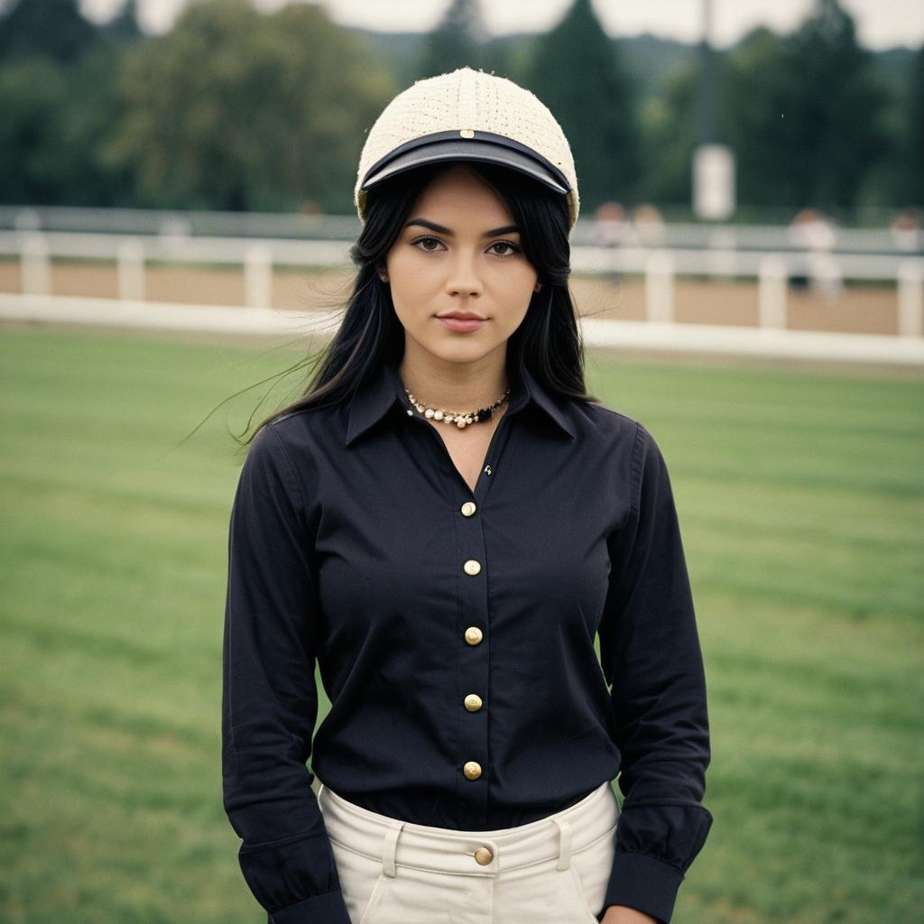 Portrait of a young woman wearing a jockey costume, featuring a black buttoned shirt with gold buttons, white pants, and a cream-colored hat. She has long black hair, brown eyes, and wears a beaded necklace. The image is taken outdoors on a green field with a blurry fence and trees in the background.