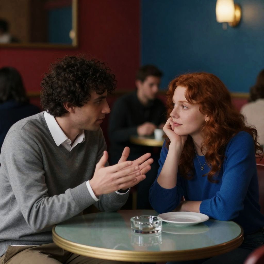 Two people in a cozy room, sitting across from each other. The man with short dark hair, striped sweater, and jeans looks at the woman with reddish hair tied back, wearing a dark long-sleeve shirt. Warm light from window blinds. Desk with lamp, book, and green plush toy in background. Both holding cups. Woman smiles slightly, man focused. Casual, intimate setting.