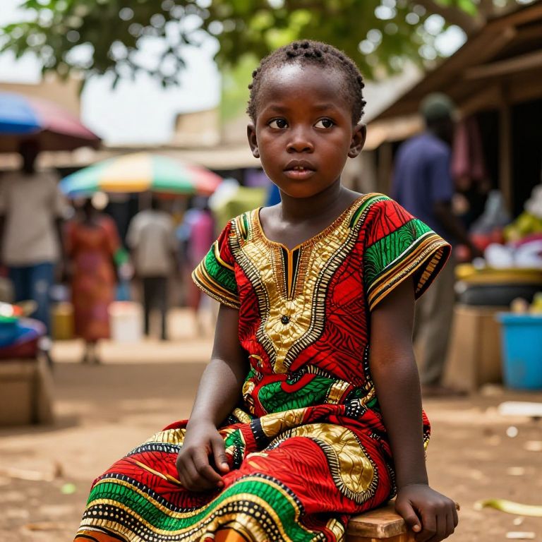 Photograph of a young African girl with dark skin, wearing a vibrant red and green traditional dress with intricate gold patterns, seated outdoors in a bustling market