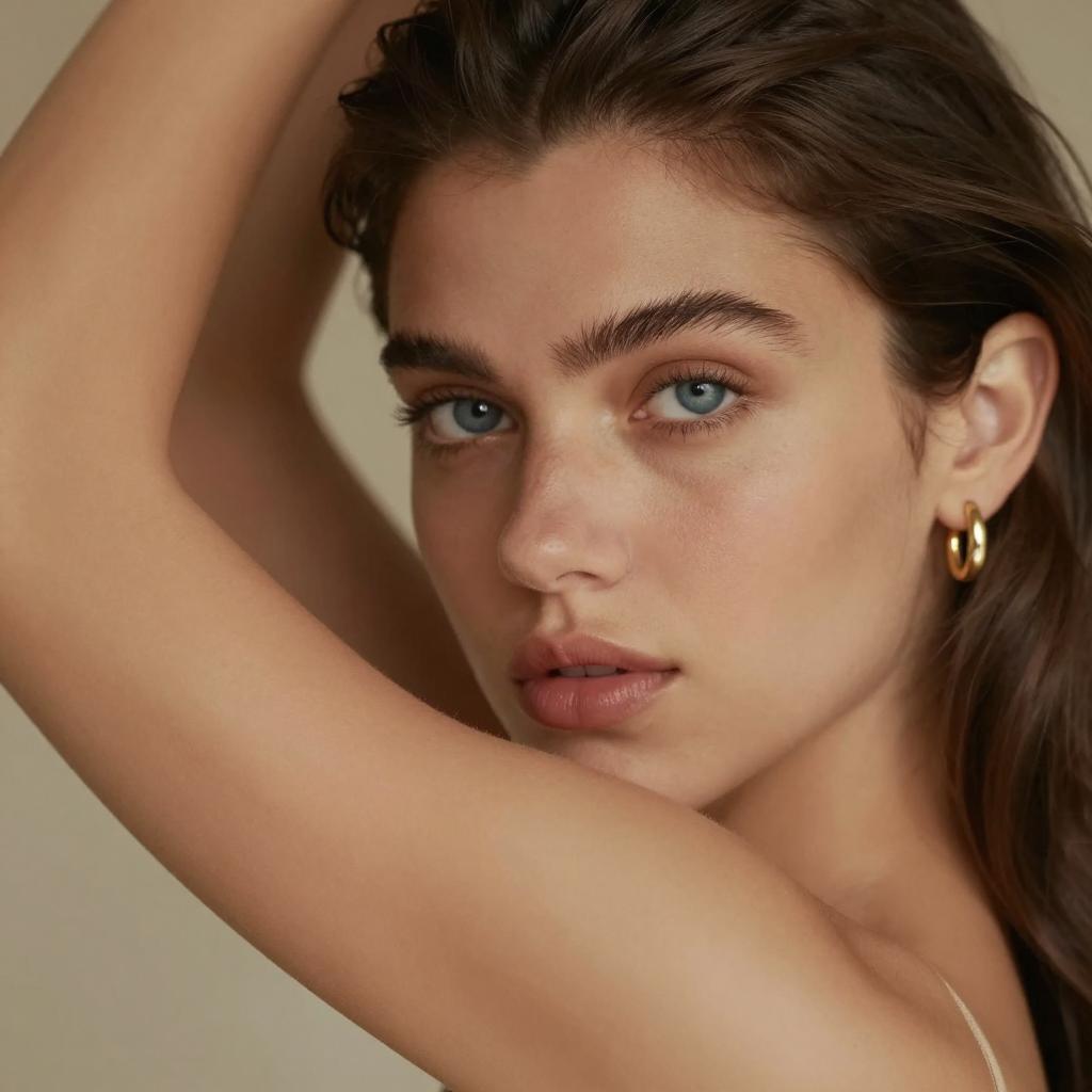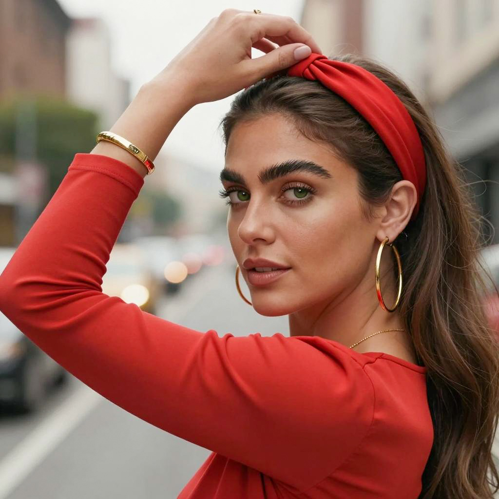 Photograph of a woman with olive skin, green eyes, and full eyebrows. She has long brown hair, wearing a red headband, red long-sleeve top, large gold hoop earrings, and a gold bracelet. She is looking over her shoulder with a subtle smile. Her right arm is raised, hand touching the headband. Background is blurred urban setting.