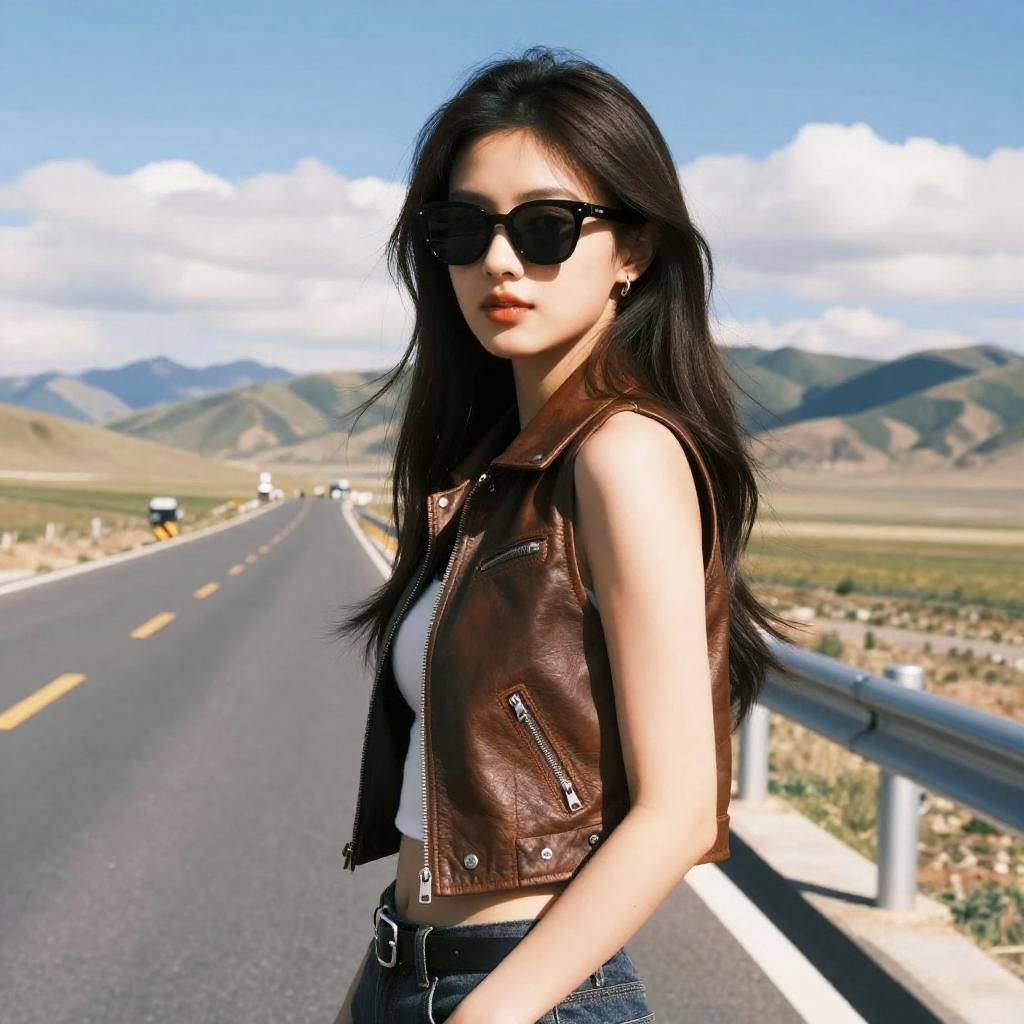 Portrait of a fashionable young Asian woman standing on a road surrounded by mountains and open landscape. She is wearing black sunglasses, a brown leather vest, a white cropped top, and dark jeans with a black belt. The backdrop features a clear sky with scattered clouds and distant mountain ranges, evoking a sense of adventure and freedom.