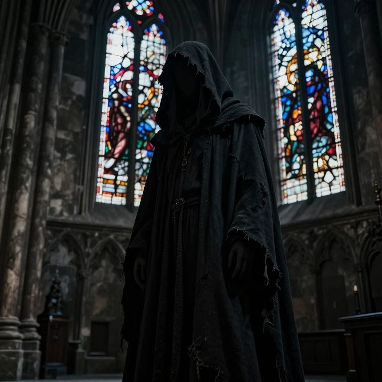 Photograph of a hooded figure in a dark, tattered cloak standing in a dimly lit, Gothic-style cathedral. The figure's face is obscured by shadows, creating a mysterious and ominous presence. The background features large, colorful stained glass windows with intricate patterns, casting a soft, multicolored light onto the stone walls and pillars. The cathedral's architecture is detailed with arches and columns, adding to the historical and sacred atmosphere. The overall image has a dramatic, dark contrast between the shadowy figure and the brightly lit stained glass.