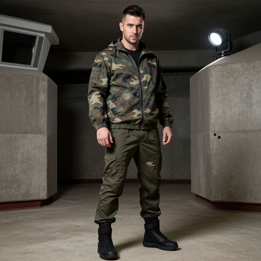 A man, camouflage-patterned windbreaker, tapered jogger pants, high-top tactical sneakers, standing among concrete bunkers, watchtowers with searchlights, overhead shot, focused expression, rugged and determined.Man has masculine face and piercing eyes