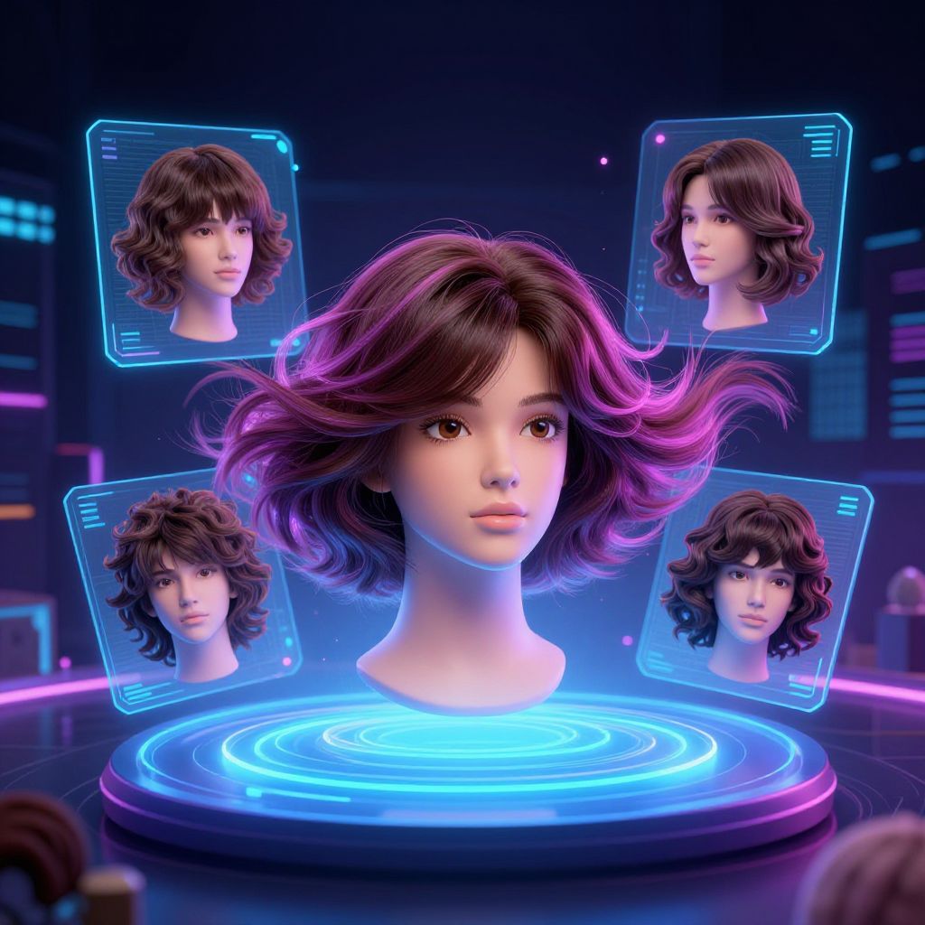 Virtual wig try on online futuristic platform with a floating holographic display, multiple wig options swirling around a central head model, neon color palette, ultra-realistic hair fibers, dynamic movement, ambient digital background, cutting-edge technology and creativity