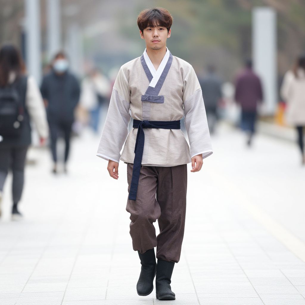 Photograph of an East Asian man with short brown hair, wearing a white traditional Korean hanbok with blue stripes and black pants, walking down a