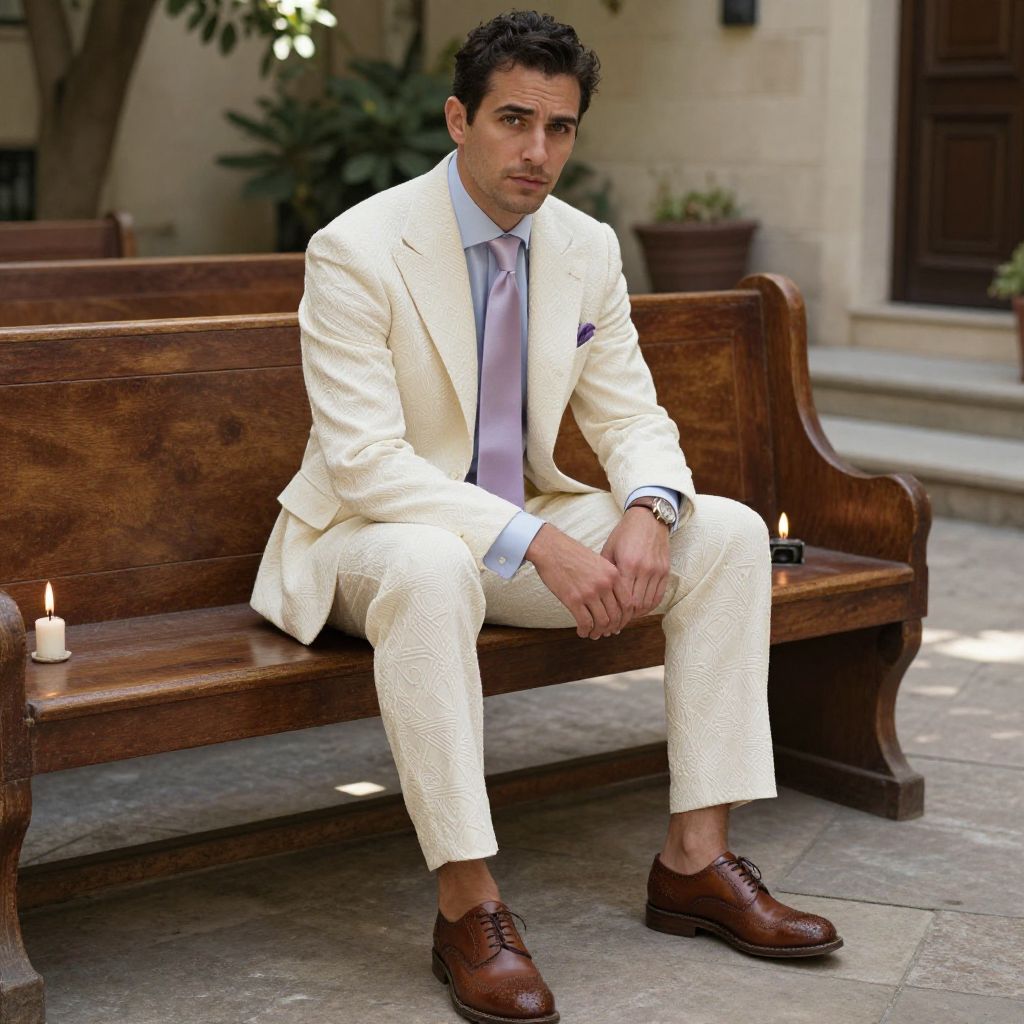 Photograph of a handsome, middle-aged Caucasian man with short, dark hair standing in a sunlit green field. He wears a crisp, cream-colored suit with a white shirt and dark blue polka-dot tie. A white pocket square is neatly tucked into his breast pocket, and he has a silver wristwatch on his left wrist. His right hand is gently touching his suit lapel. In the background, there is an old, weathered wooden barn with a dark roof. The sky is clear, and the field extends into the distance. The image has a bright, high-contrast style, emphasizing the subject and the vibrant greenery.