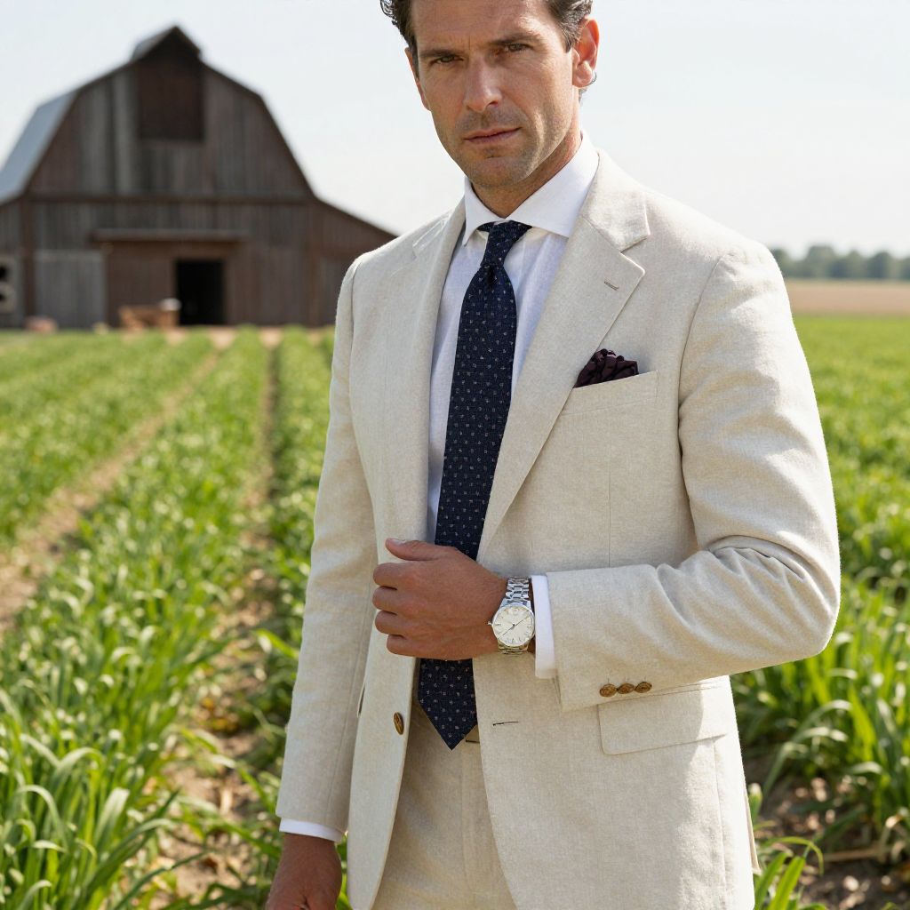 A man, beige cotton suit, white linen dress shirt, navy paisley tie, dark brown leather monk straps, sophisticated silver dress watch, sun-drenched fields, vibrant green rows, rustic wooden barn, Cibachrome style, confident expression. Man has masculine face and piercing eyes