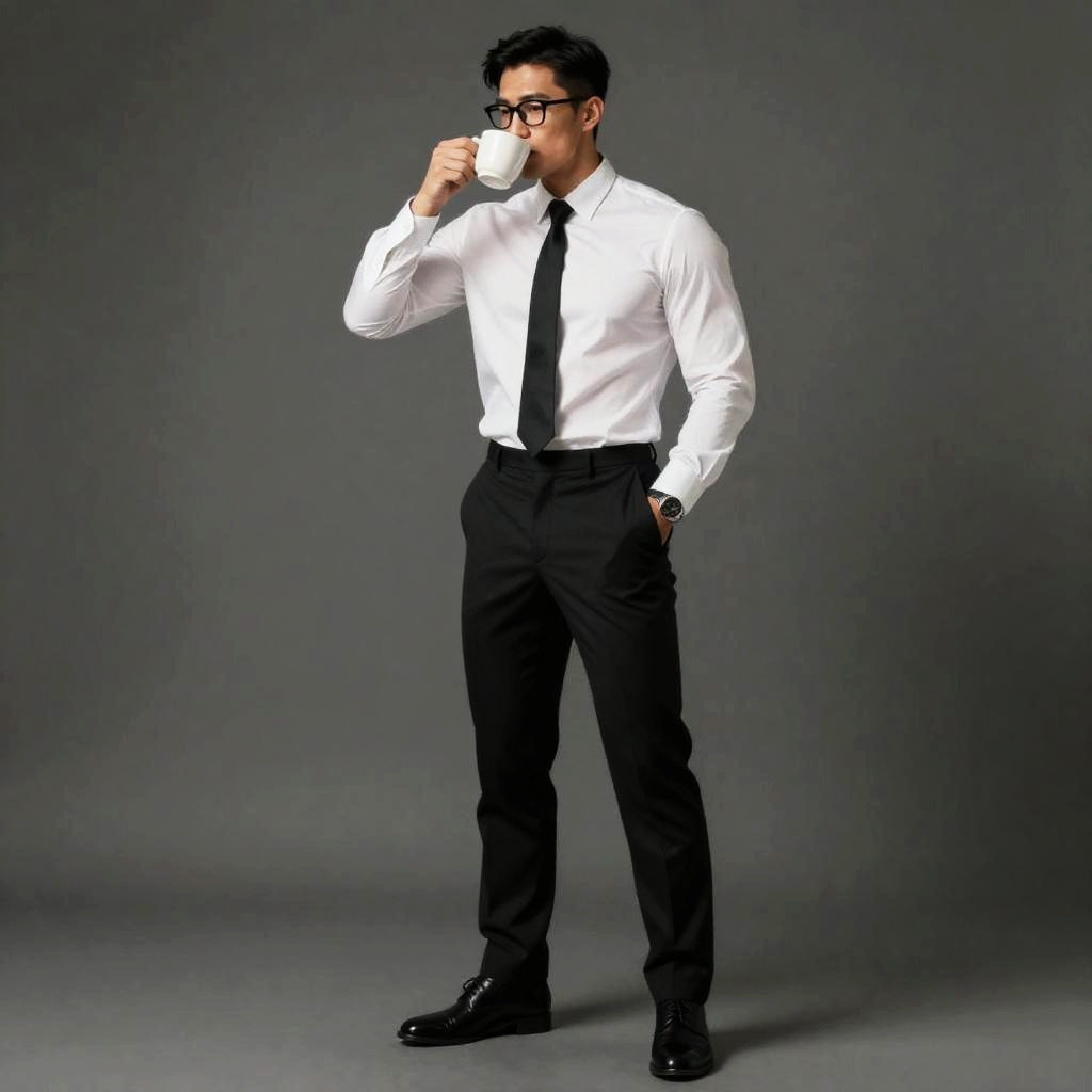A full-body image of a young Asian man wearing a long-sleeve white dress shirt, black tie, and black suit pants, standing against a gray background. He is wearing black glasses and black formal shoes, holding a white coffee cup close to his mouth and drinking from it. The photo features soft lighting and a subtle film grain effect, capturing a professional and stylish look.