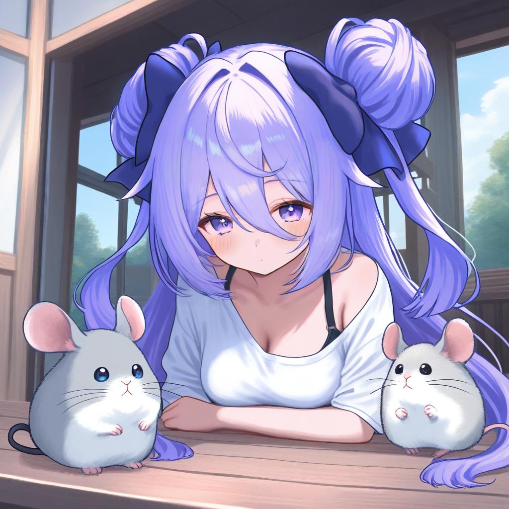 Digital illustration of an anime girl with very long purple and blue hair styled in double buns with blue bows. She has large blue and purple eyes partially covered by hair, a white off-shoulder shirt, and medium breasts. Next to her is a cute white chinchilla illuminated by soft natural light in a room with wooden flooring and walls. The image features vibrant colors and detailed shading typical of anime art.